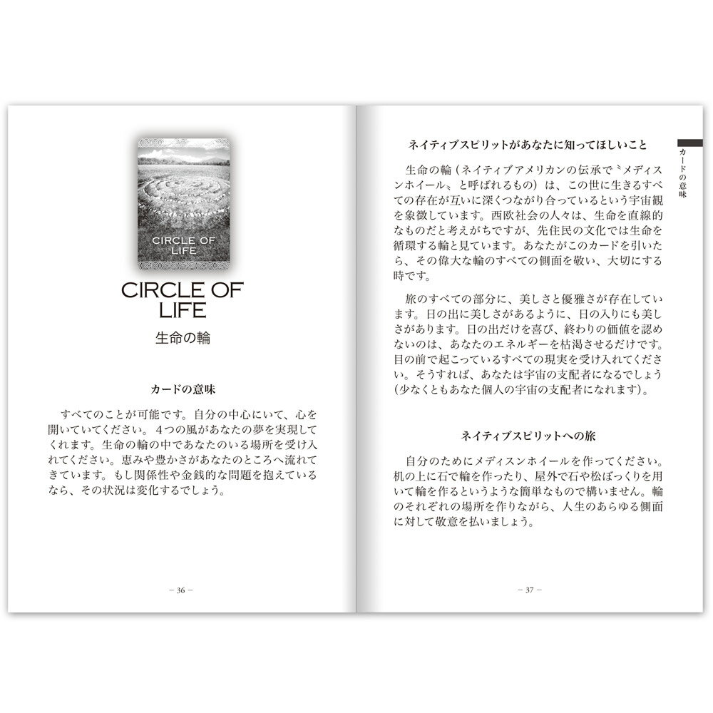 また解説書では、スプレッド、カードとは別に夢の解釈の仕方、サインやシンクロニシティの解釈の仕方などを紹介しているほか、それぞれのメッセージでは「カードの意味」「ネイティブスピリットがあなたに知ってほしいこと」「ネイティブスピリットへの旅(イメージする瞑想)」の3つが紹介されています。